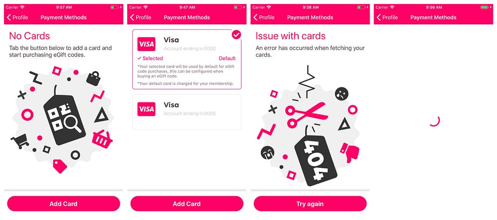 We can add sub-states to this error state e.g. a refresh control, so the user can pull down this page and attempt to refresh as if it was a list. This sub-state will be empty -> error -> loading.